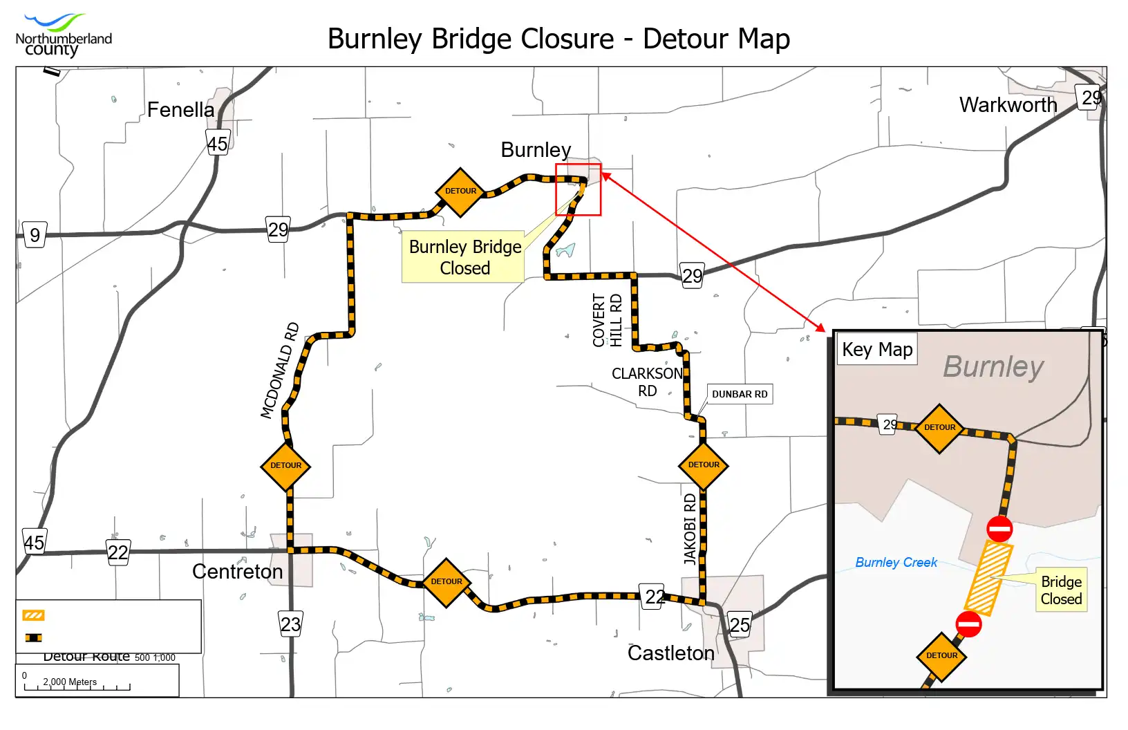 Cobourg, ON – July 9, 2025 – Northumberland County is moving forward with the replacement of Burnley Bridge, located on County Road 29 in the village of Burnley, with construction scheduled to begin on July 11, 2025. The bridge will be closed to all traffic from July 11 through to November 2025, with local detours in place.