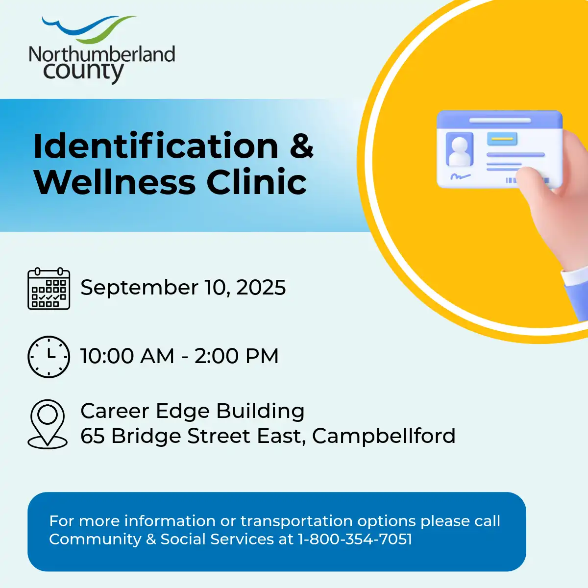 Cobourg, ON – September 2, 2025 – Access to a valid ID is essential for connecting individuals and families to vital services, employment, housing, and other opportunities that support well-being and success. To help reduce the barriers to obtaining or replacing identification, Northumberland County Community & Social Services, in collaboration with local community and government agencies, is hosting a one-day Identification and Wellness Clinic on Wednesday, September 10, at the Career Edge Building (65 Bridge Street East, Campbellford) from 10:00 a.m. to 2:00 p.m.